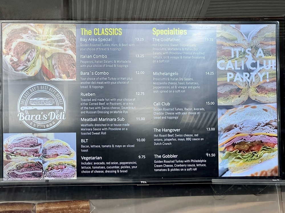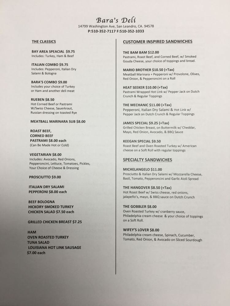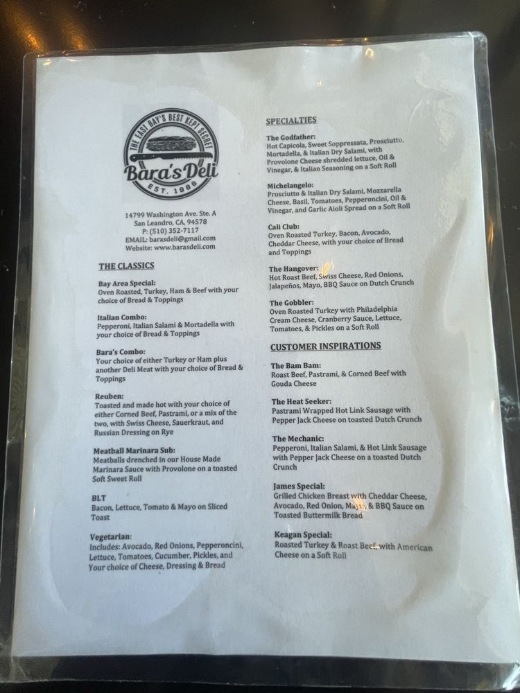 Bara's Deli, located in San Leandro, CA, is a renowned spot for salads, deli sandwiches, and hearty meals. With a diverse menu featuring customer favorites like the Chipotle Chipotle Chicken Breast and the Italian Combo sandwich, Bara's Deli offers a wide range of options for all tastes. The Michelangelo sandwich, packed with Prosciutto & Italian Salami, Mozzarella cheese, basil, and tomatoes, is a must-try for sandwich enthusiasts. Customers appreciate the generous portions and the quality of the ingredients used in each dish. The cozy atmosphere and friendly service add to the overall dining experience. Bara's Deli is a go-to destination for those looking for delicious sandwiches with a twist.